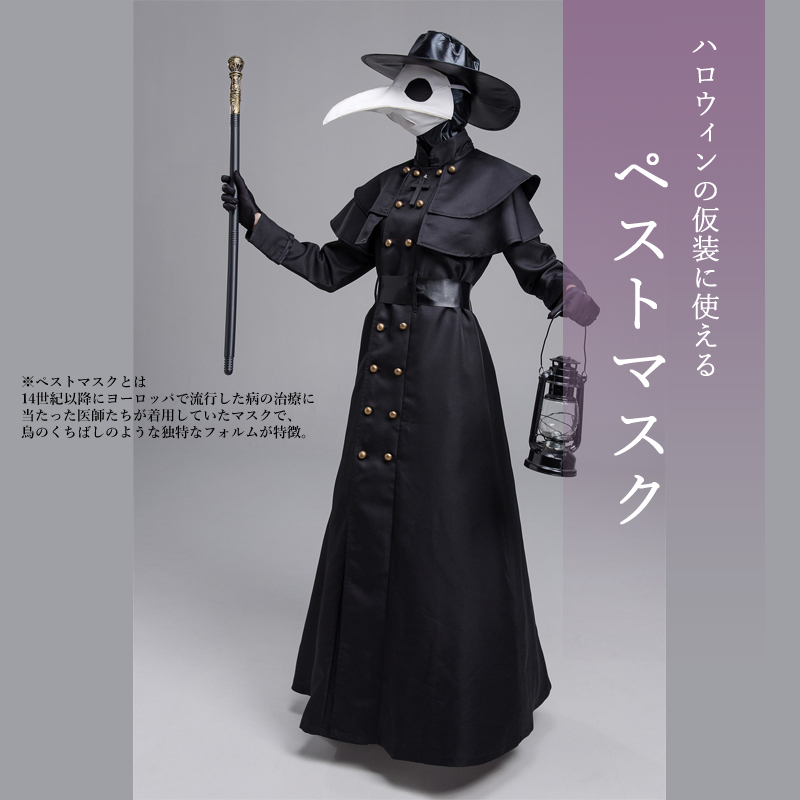 尖ったくちばしのようなマスクに黒いゴシックなワンピース。